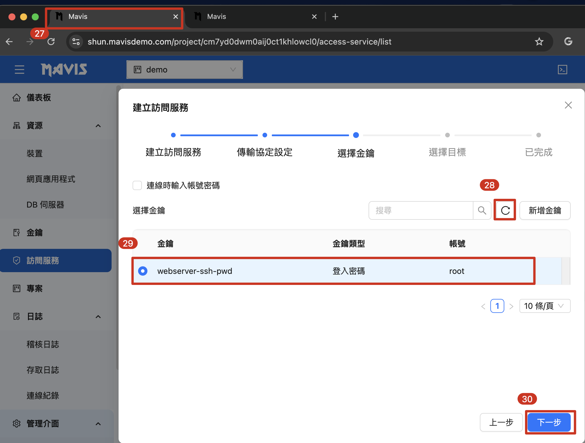 | 27. 回到剛剛「建立訪問服務 」頁面 28. 點擊 重新整理 圖示 29. 剛剛建立的金鑰 已經被勾選起來 30. 點擊 「下一步」 |