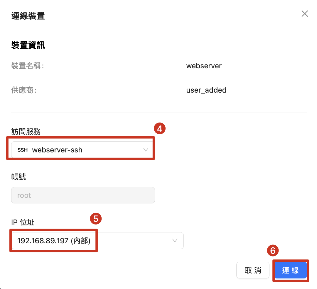 | 4. 選擇訪問服務,如果只有設定一組,使用預設 5. 選擇伺服器連線 IP,如果只有伺服器只有一組 IP,使用預設 6. 點擊「連線」 |