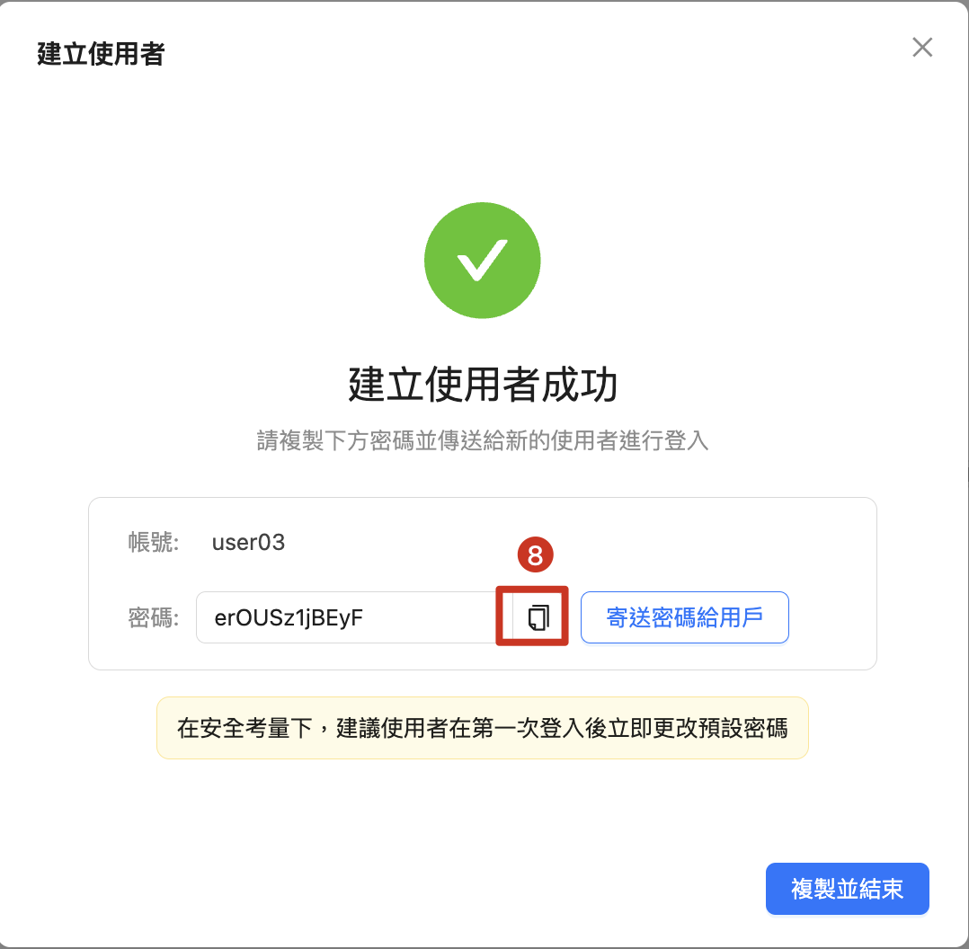 | 8. 將一次性產生的密碼,傳給使用者 9. 複製密碼後,結束 PS:如果要使用 「寄送密碼給用戶」, 需先到「管理介面」=>「系統管理」 =>「郵件服務設定」 設定 |