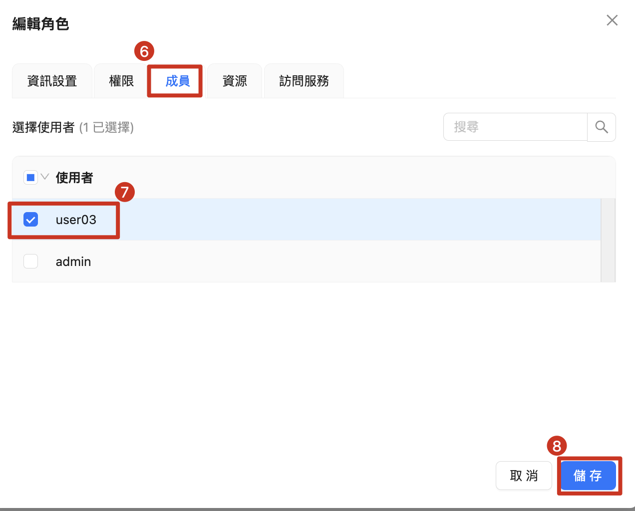 | 6. 選擇 成員 7. 勾選 使用者帳號 8. 點擊 儲存 |