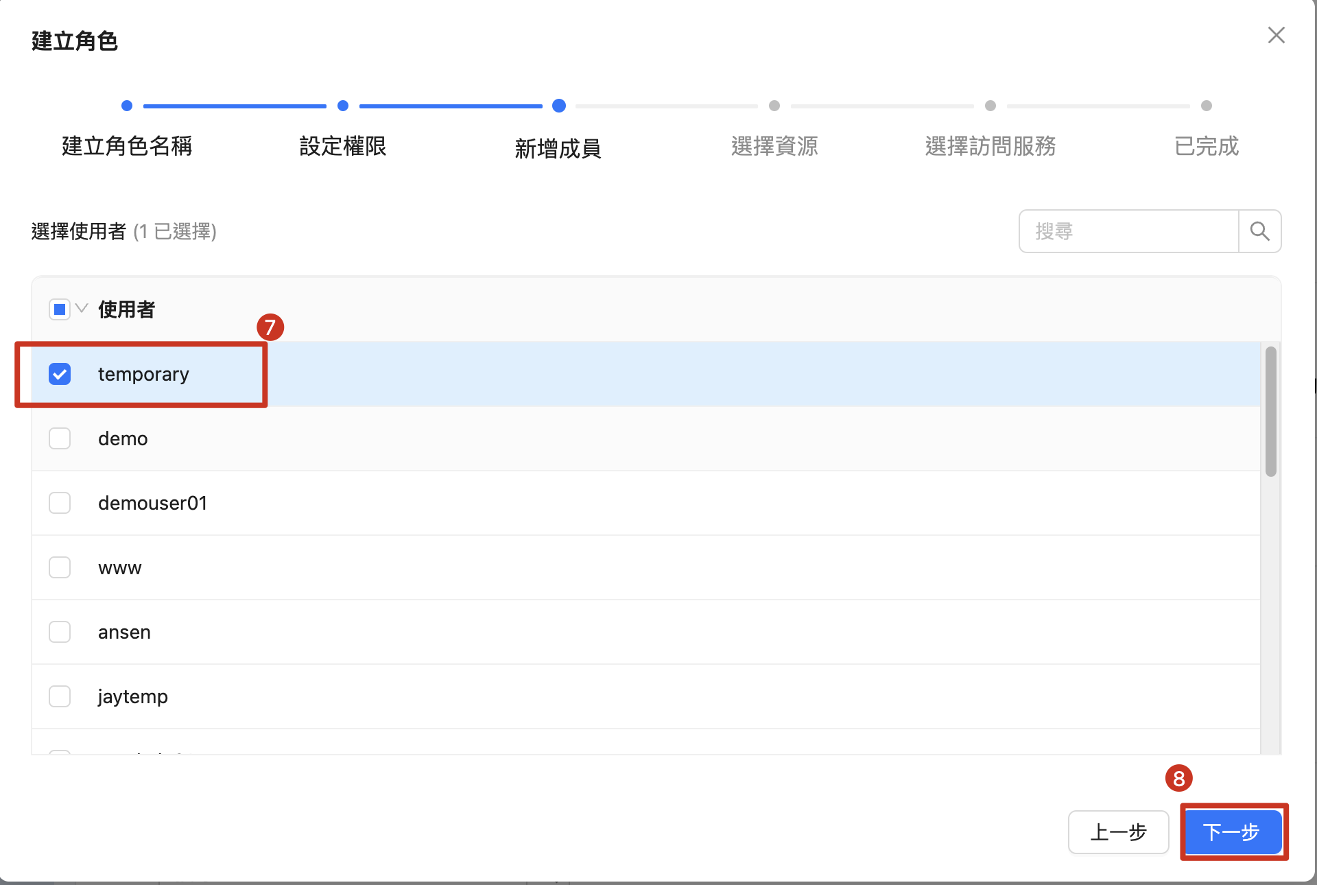 | 7. 勾選 使用者 (在此選擇已建立的臨時帳號) 8. 點擊 「下一步」 |
