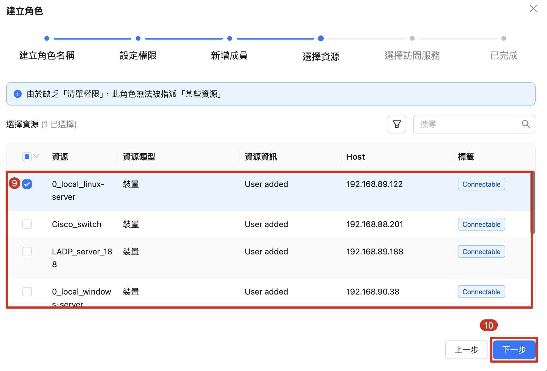 | 11. 勾選 "快速選擇先前選擇的 1 個資源的訪問服務 " PS:此選項將自動勾選所選裝置對應的訪問服務。 12. 點擊 「下一步」 |