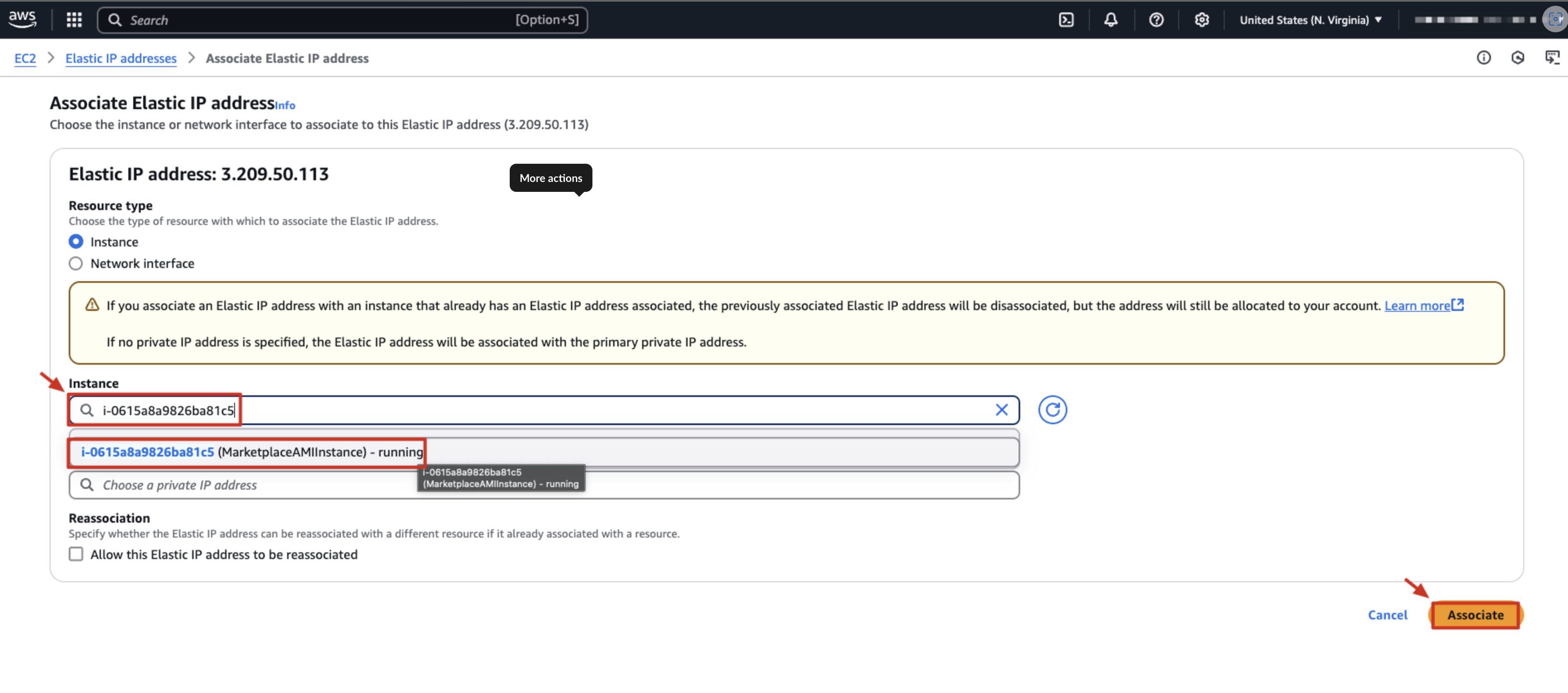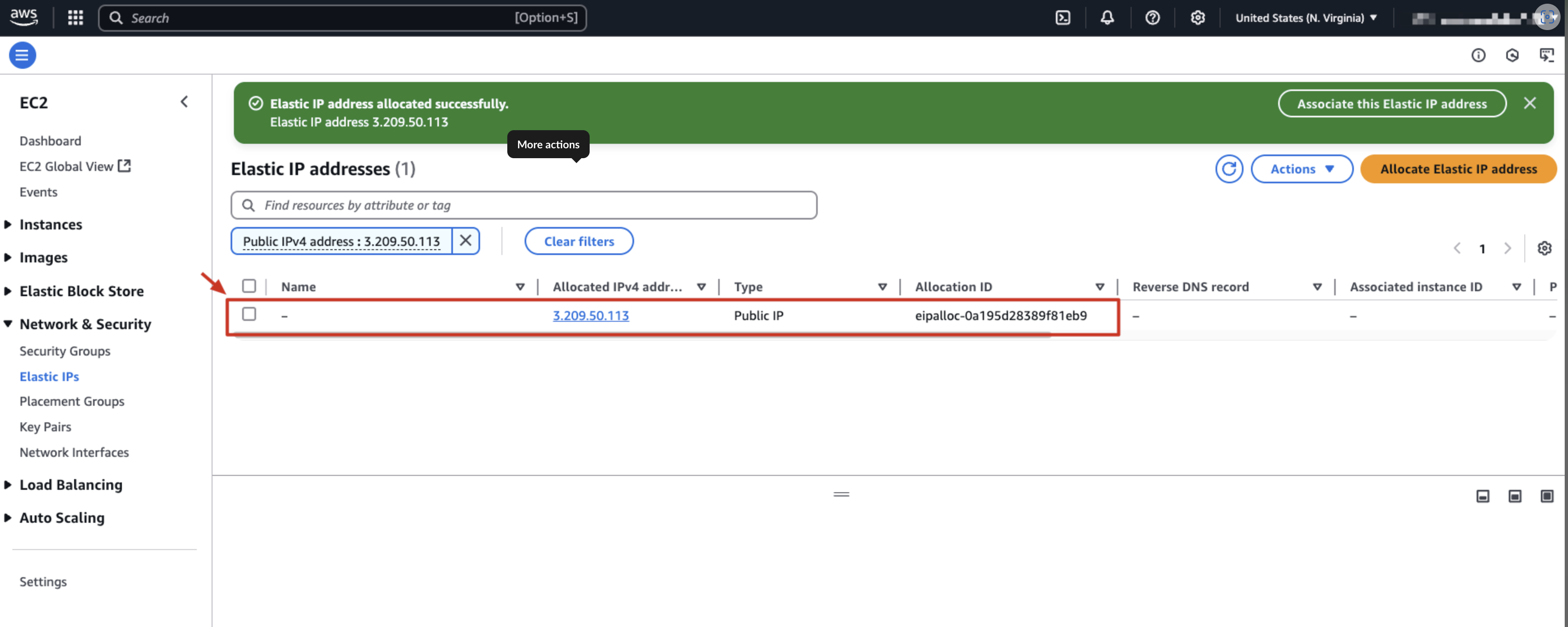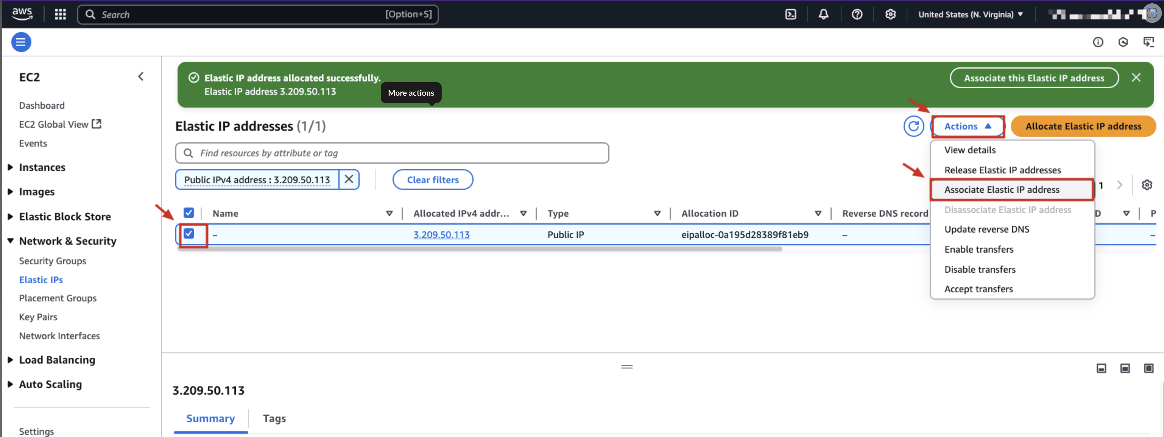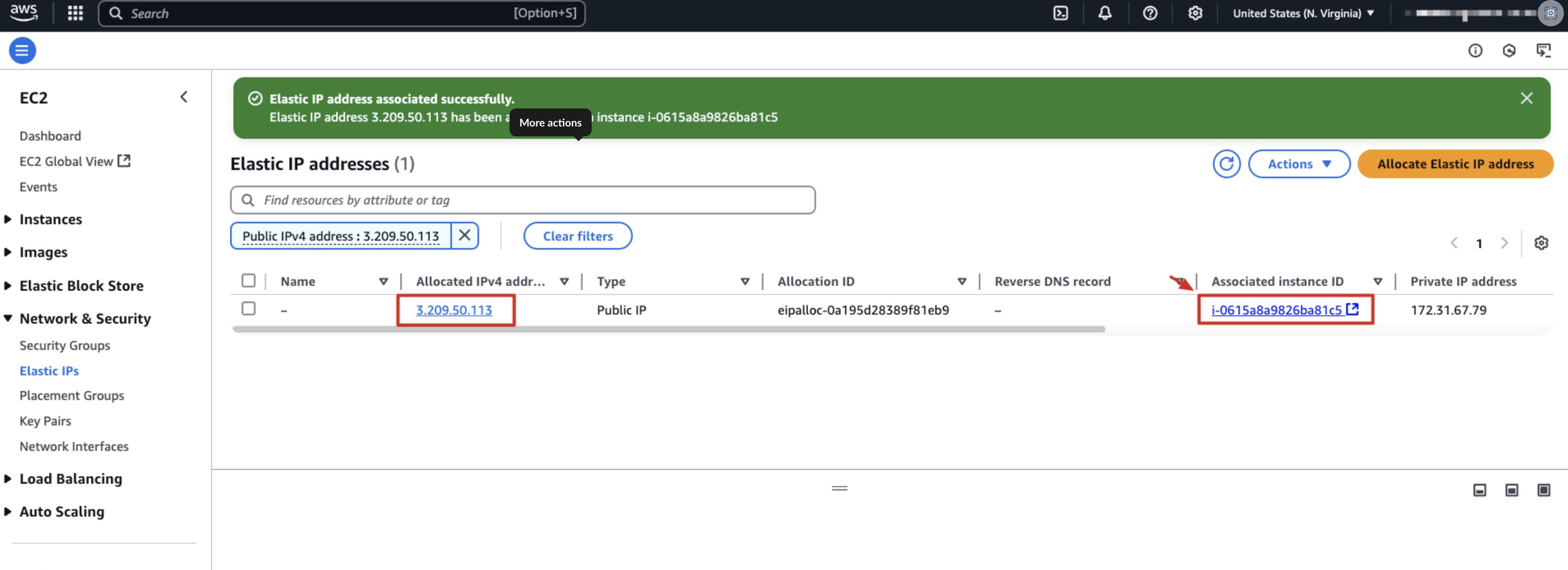 その後、AWS から割り当てられた Elastic IP を確認できます。
