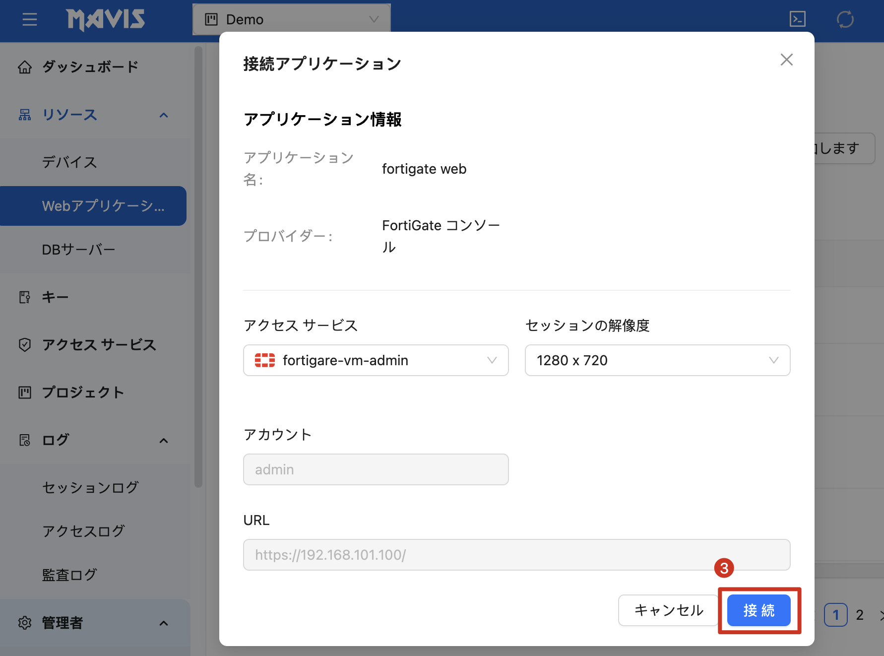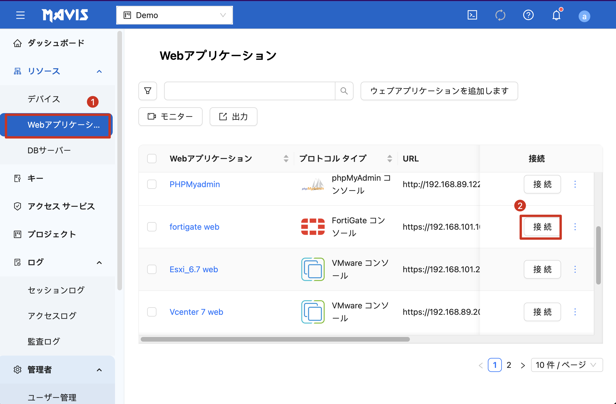 | 手順 1. Web アプリケーションをクリックします(本例では FortiGate を使用)。 手順 2. 接続する Web アプリケーションをクリックします。 |
