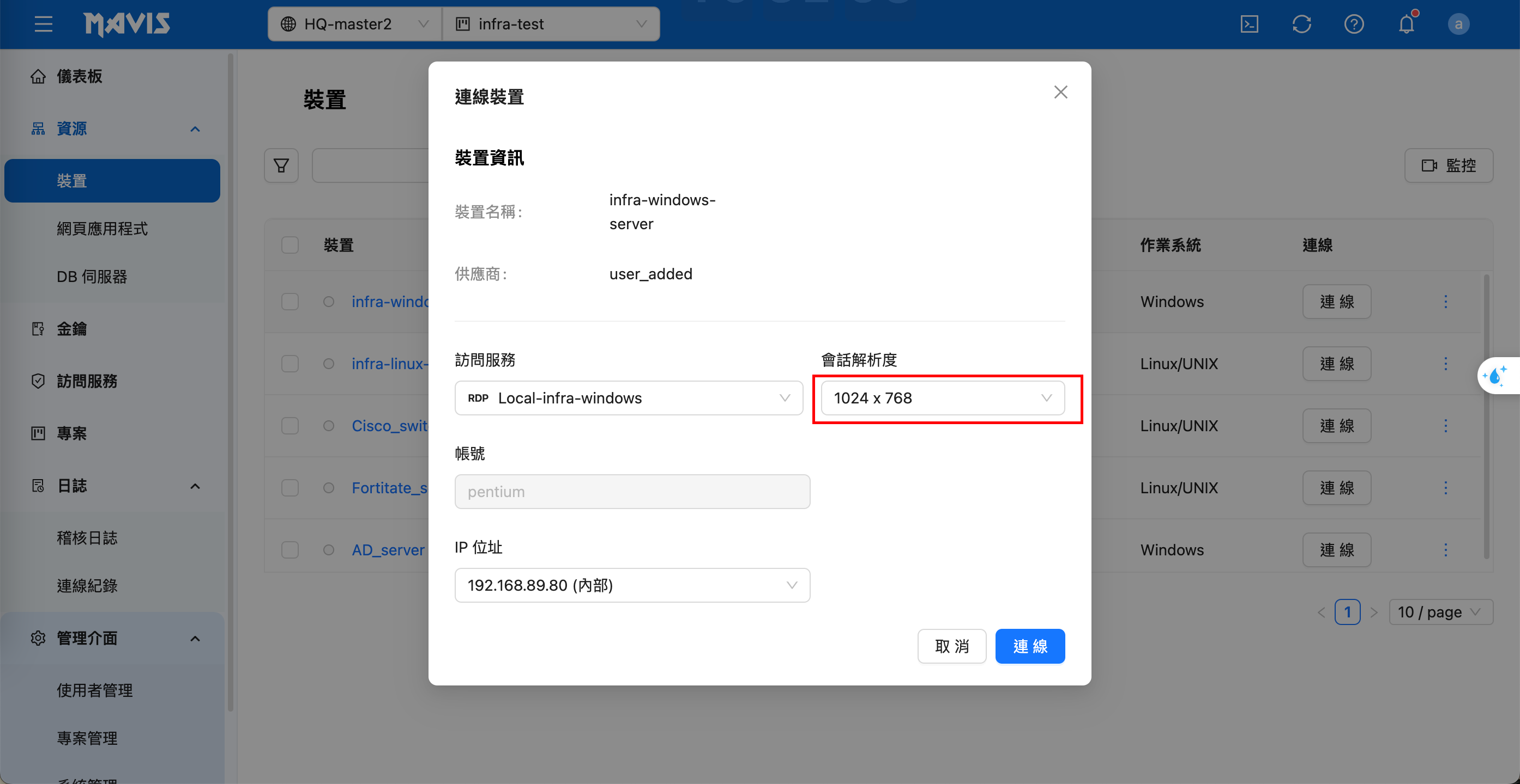 サーバーがアクセスサービスに関連付けられている場合、「接続」をクリックして接続を開始できます。