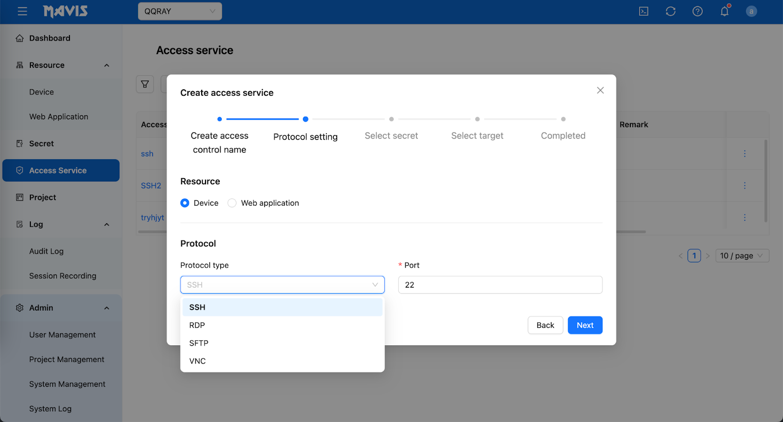Mavisは現在、SSH、RDP、VNC、SFTP、FTPプロトコルをサポートしています。接続を開始する手順は以下の通りです。