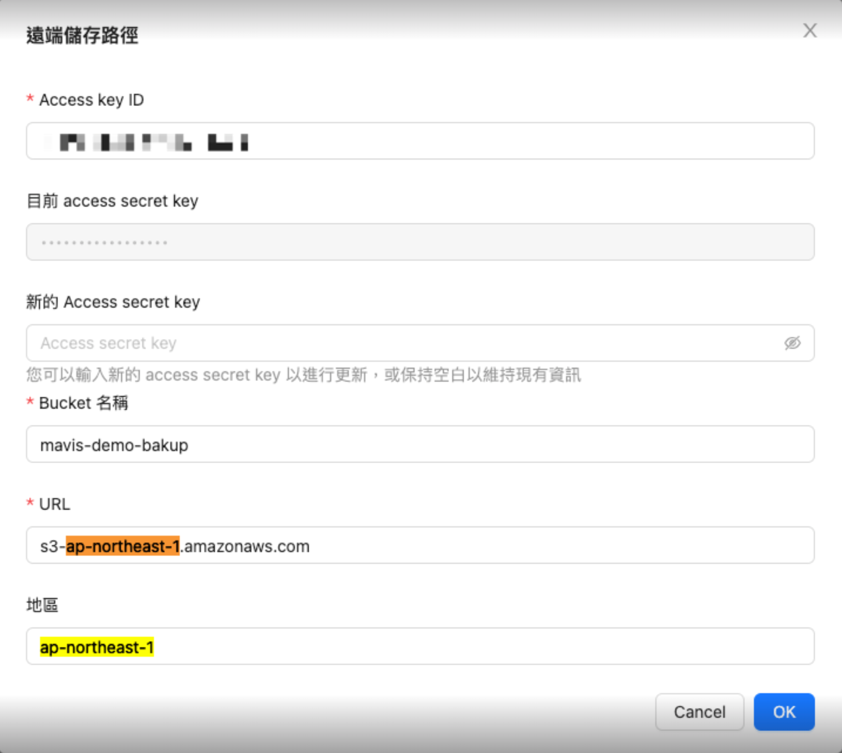 - URL 特殊情境說明:使用 AWS S3 服務時,設定路徑需要將 Region 資訊添加到 URL 欄位中,以避免路徑錯誤的問題。(判斷方式為:S3 的網域包含 "amazonaws.com")