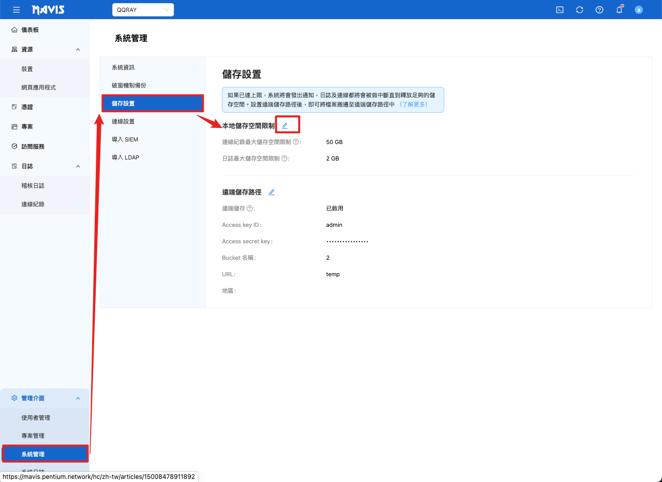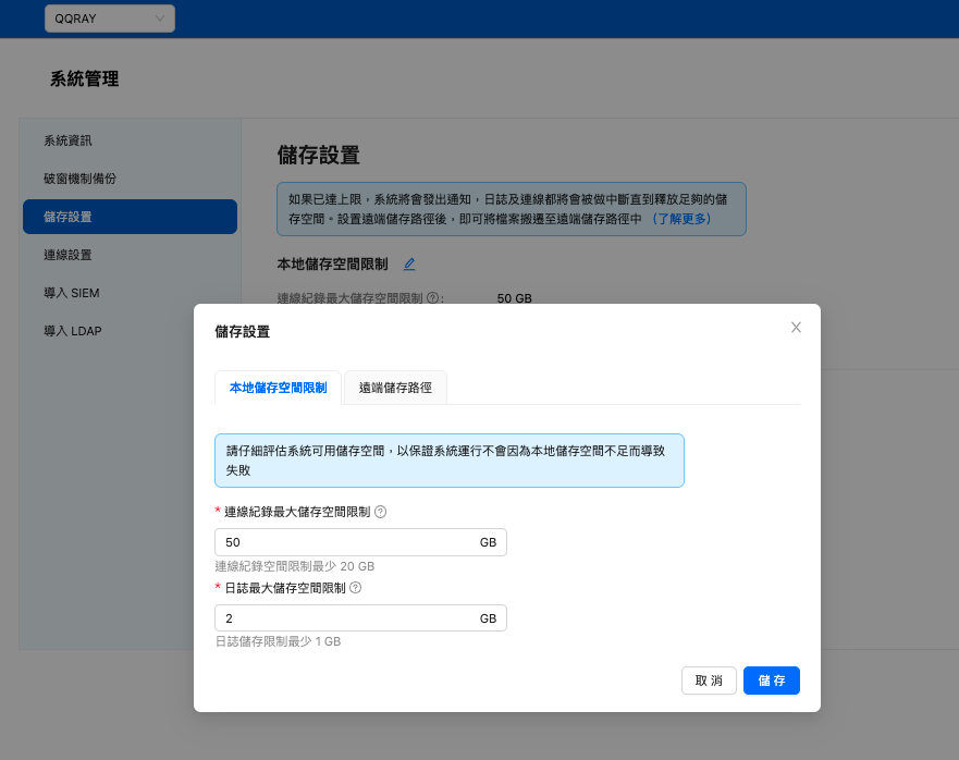 - 系統管理 > 存儲設定 > 設置 本地儲存限制