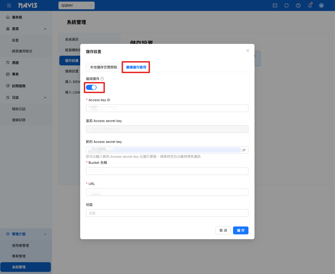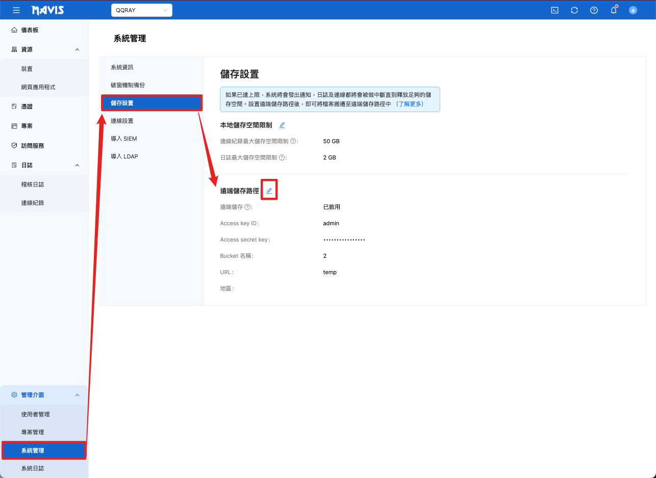- 系統管理 > 存儲設定 > 設置 遠端儲存路徑