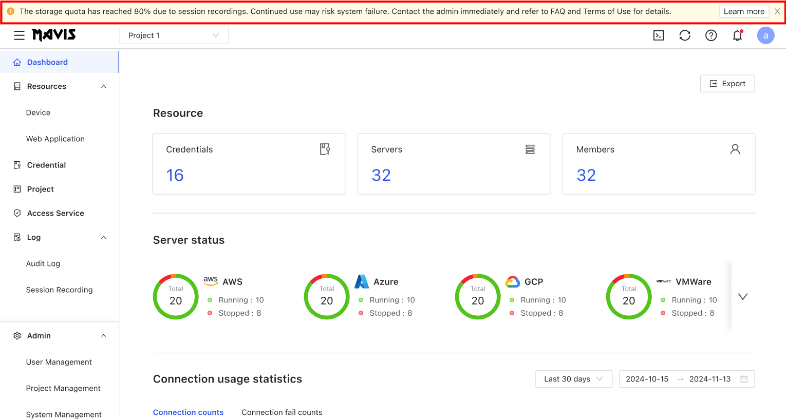 - 警告橫幅說明:由於連線紀錄的使用,系統儲存空間已達設定可用量的80%。繼續使用恐增加系統故障的風險。請立即聯繫管理員或參考 FAQ 及服務條款說明