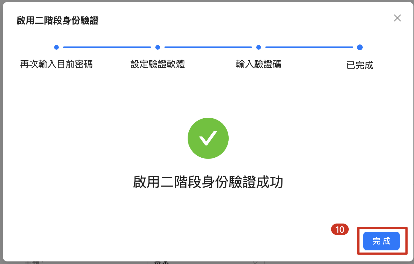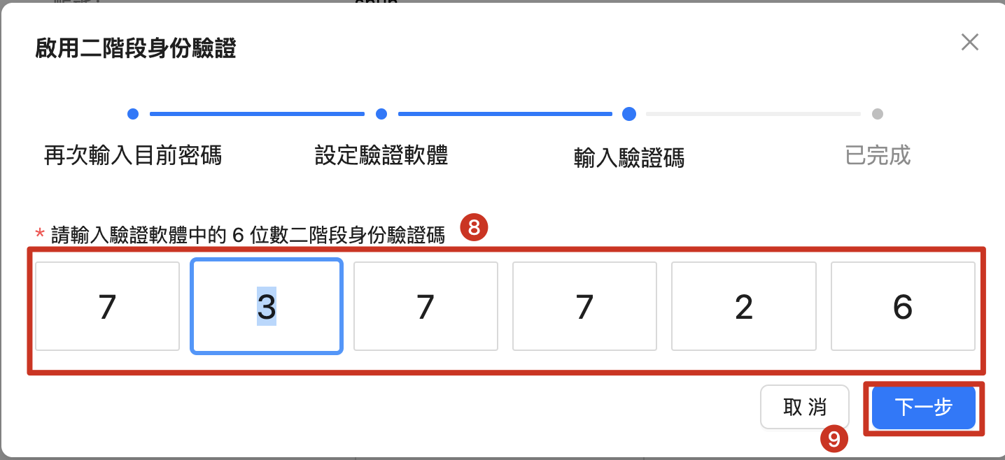 8. 輸入手機的 Google Authenticator 上的六位數二階段驗證碼 9. 下一步 |
