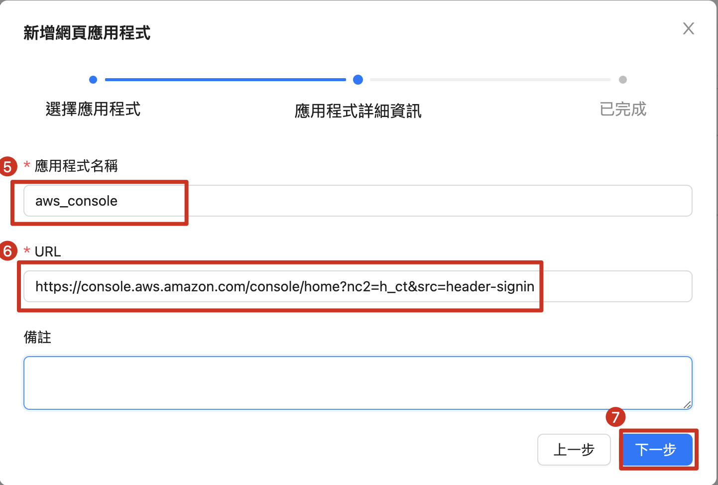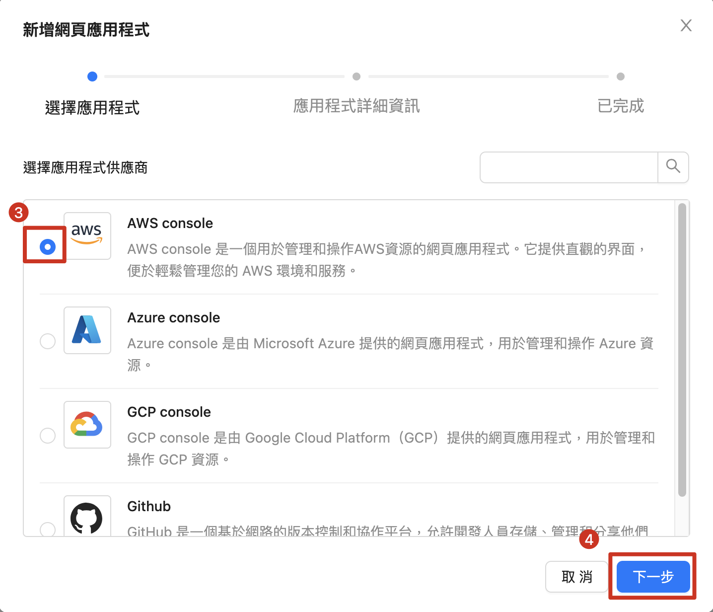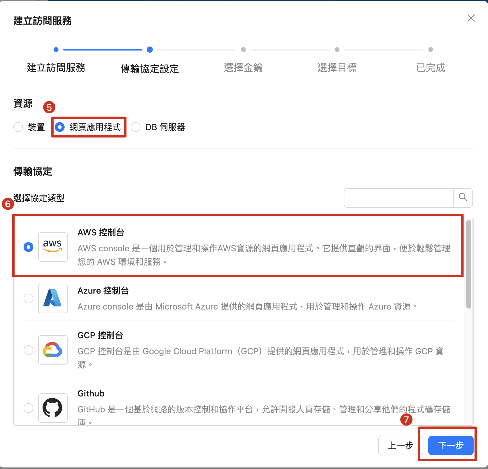 | 5. 資源類別 勾選「網頁應用程式」 6. 選擇應用程式供應商 AWS PS:這邊示範選擇AWS 7. 點擊 「下一步」 |
