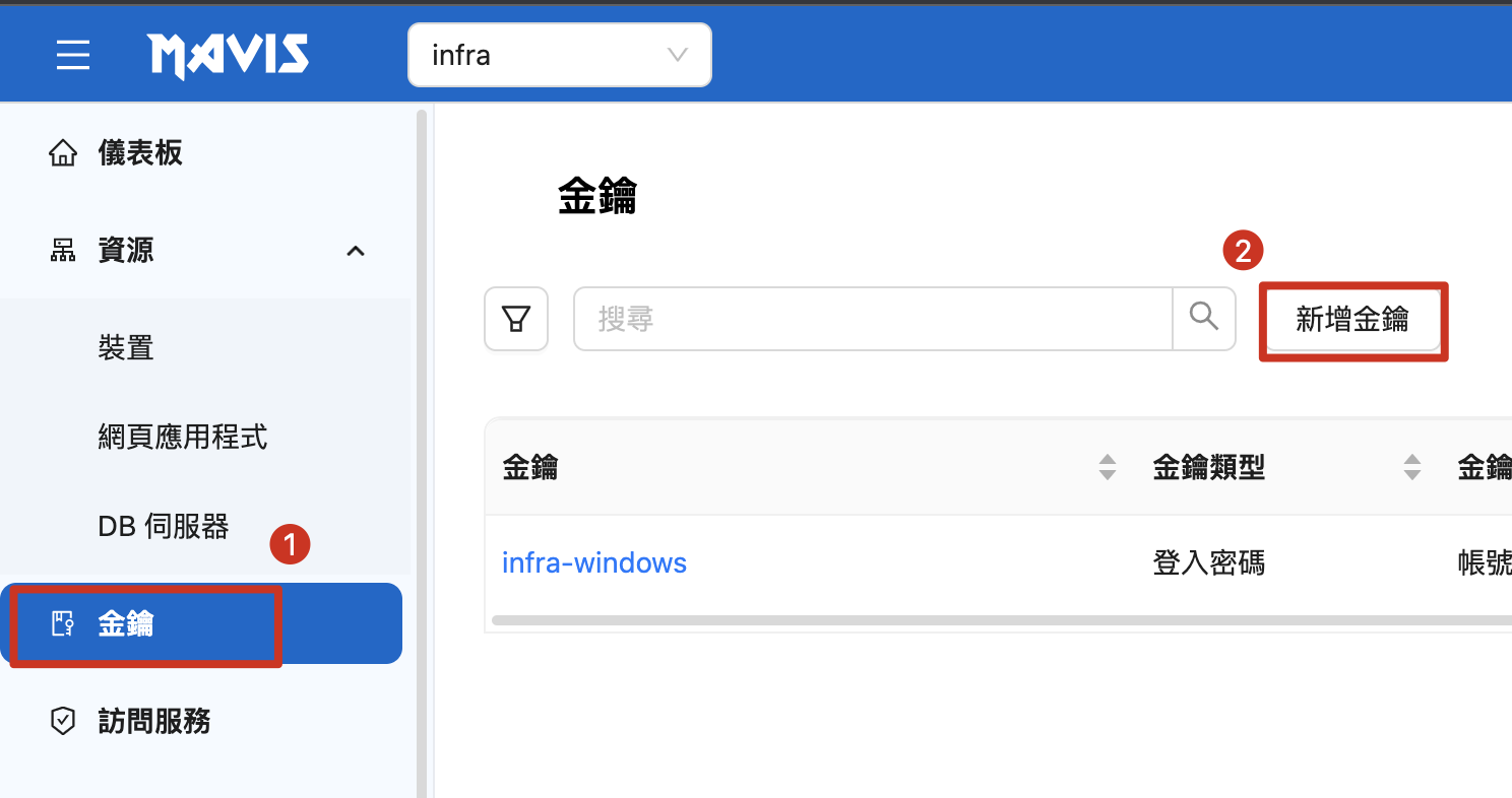 | 1. 主選單「金鑰」 2. 點擊 「新增金鑰」 |