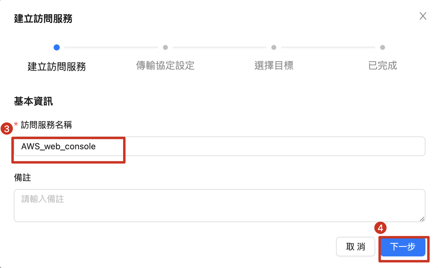 | 3. 輸入自定義訪問服務名稱 4. 點擊 「下一步」 |