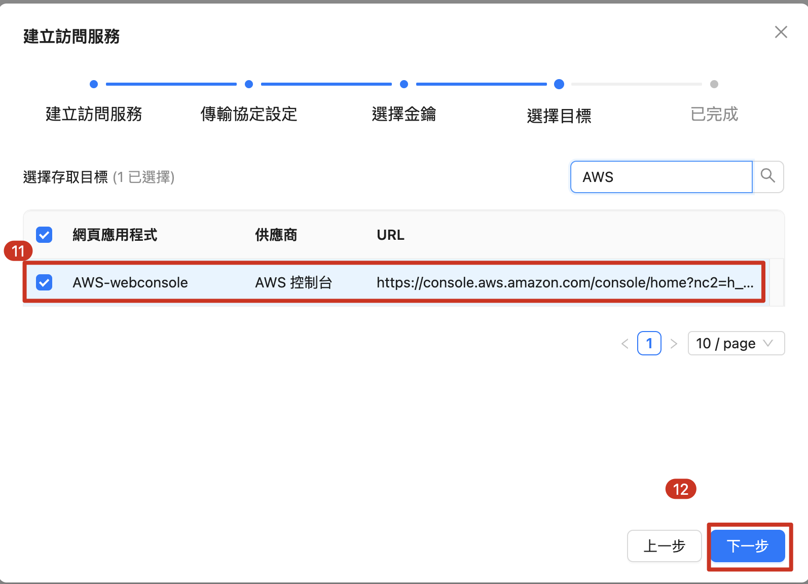 | 11. 選擇要綁定訪問服務的 Web console 12. 點擊 「下一步」 |