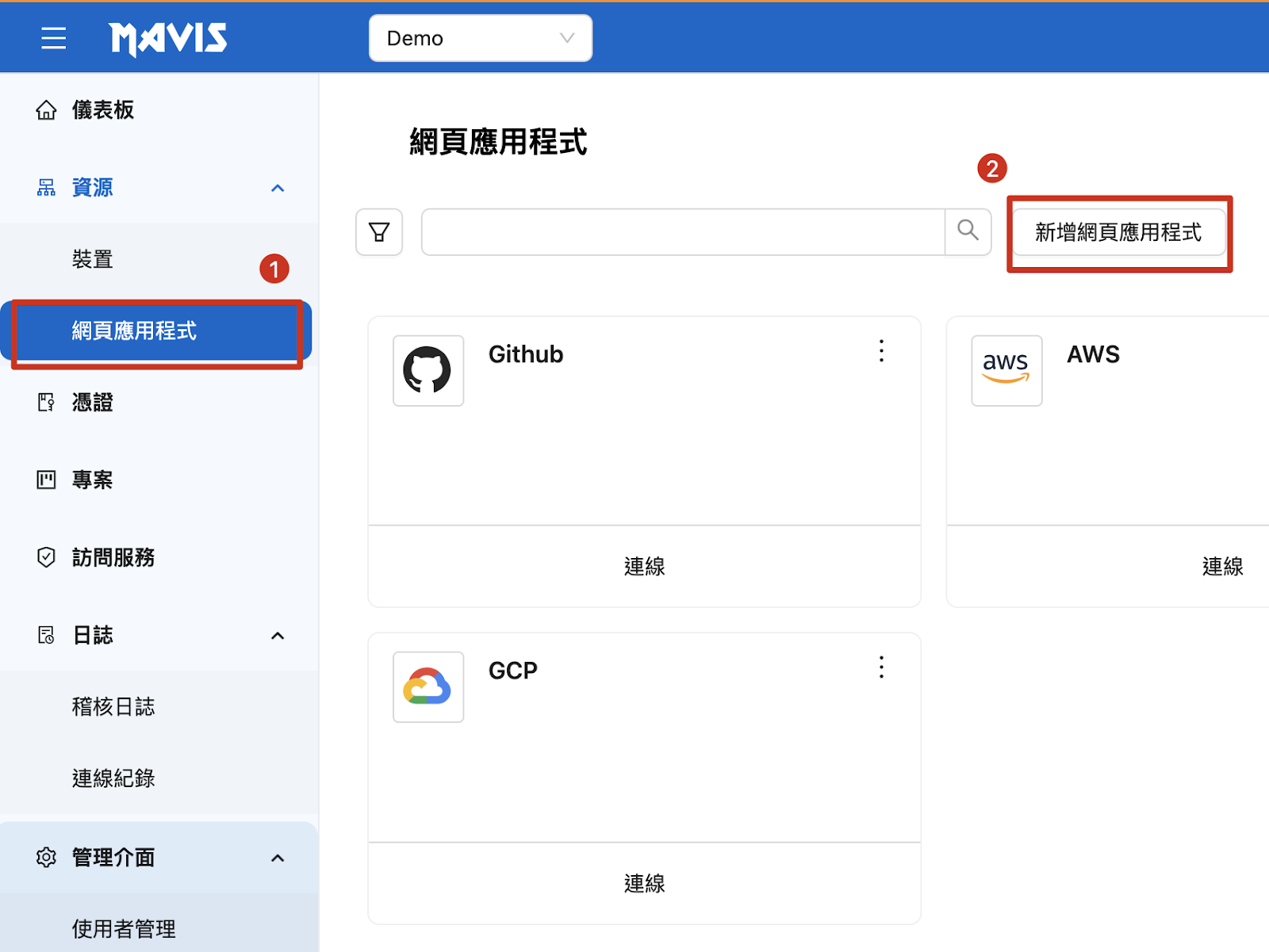 | 1. 主選單「網頁應用程式」 2. 點擊 新增網頁應用程式 |