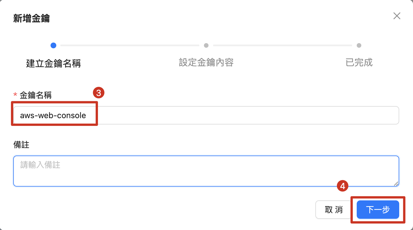 | 3. 自定義金鑰名稱 4. 點擊 「下一步」 |