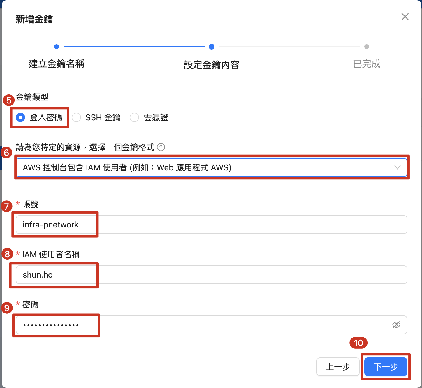 | 5. 勾選 登入密碼 6. 勾選金鑰格式 「AWS控制台包含IAM使用者...」 PS:這邊示範選擇AWS 7. 輸入 帳號 (account id) 8. 輸入 IAM 使用者帳號 9. 輸入 登入密碼 10. 點擊 「下一步」 |