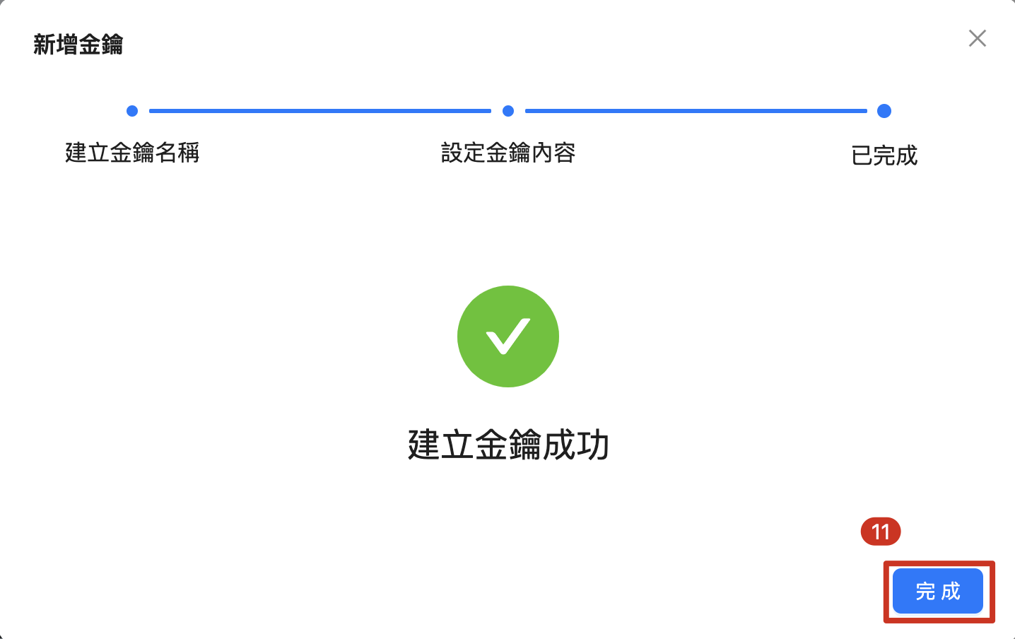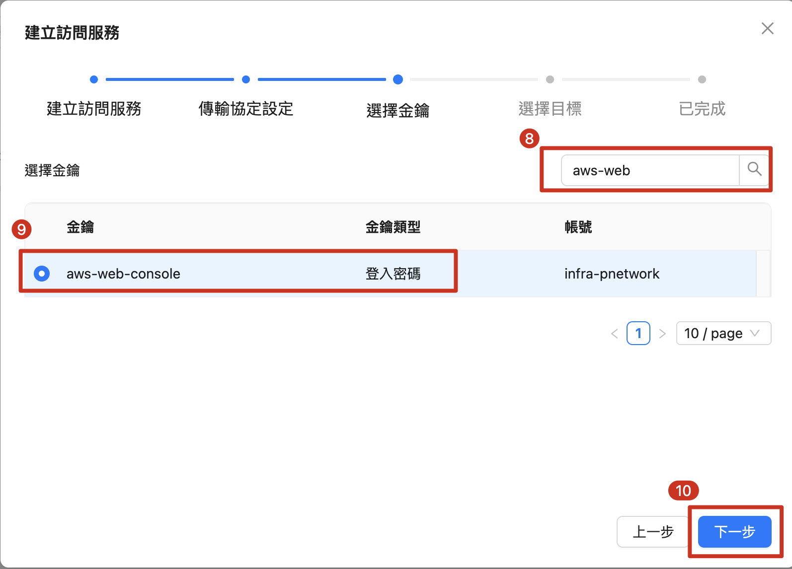 | 8. 透過篩選找到要使用的金鑰 9. 勾選 「要使要的金鑰」 10. 點擊 「下一步」 |