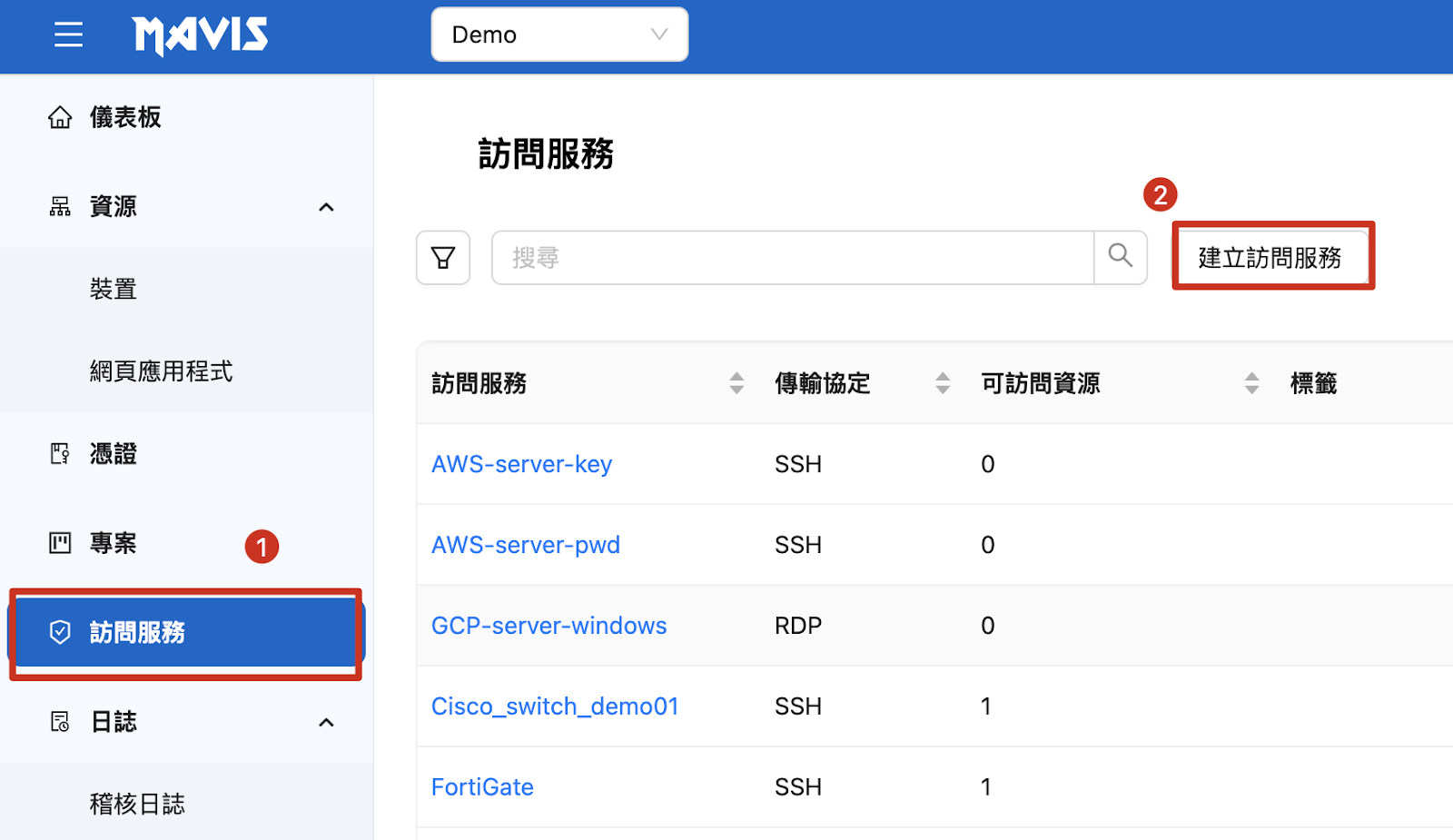 | 1. 連接到主選單「訪問服務」 2. 點擊 「建立訪問服務」 |