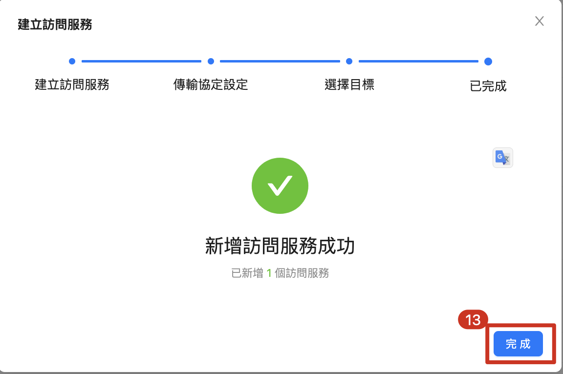 | 14. 成功新增完成,列表上可以看到你成功新增的訪問服務 |
