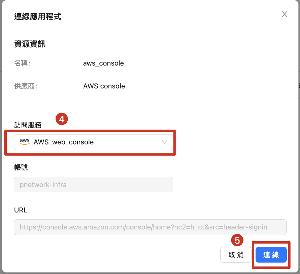 | 4. 選擇訪問服務,如果只有設定一組,使用預設 5. 點擊「連線」 |