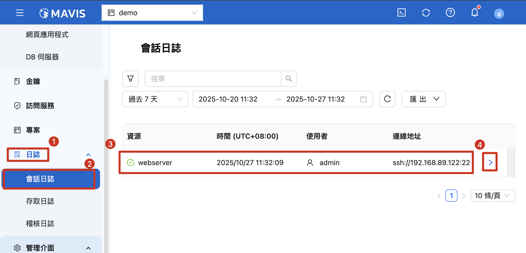1. 選擇主選單「日誌」 2. 點擊「會話日誌」 3. 選擇伺服器該筆 SSH 連線紀錄 4. 點擊「 > 」按鈕 |