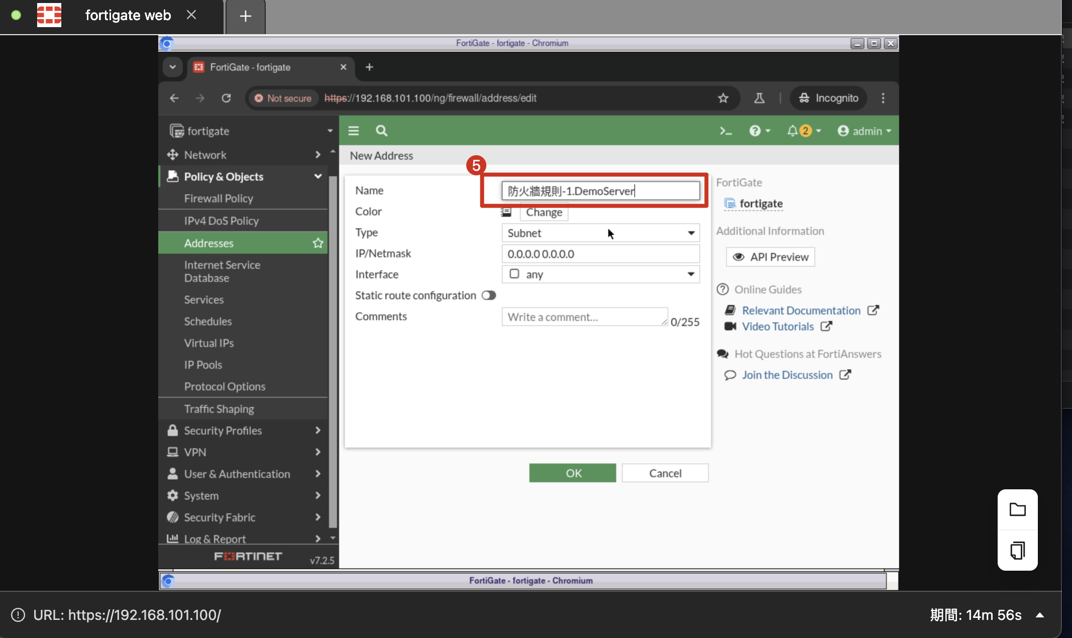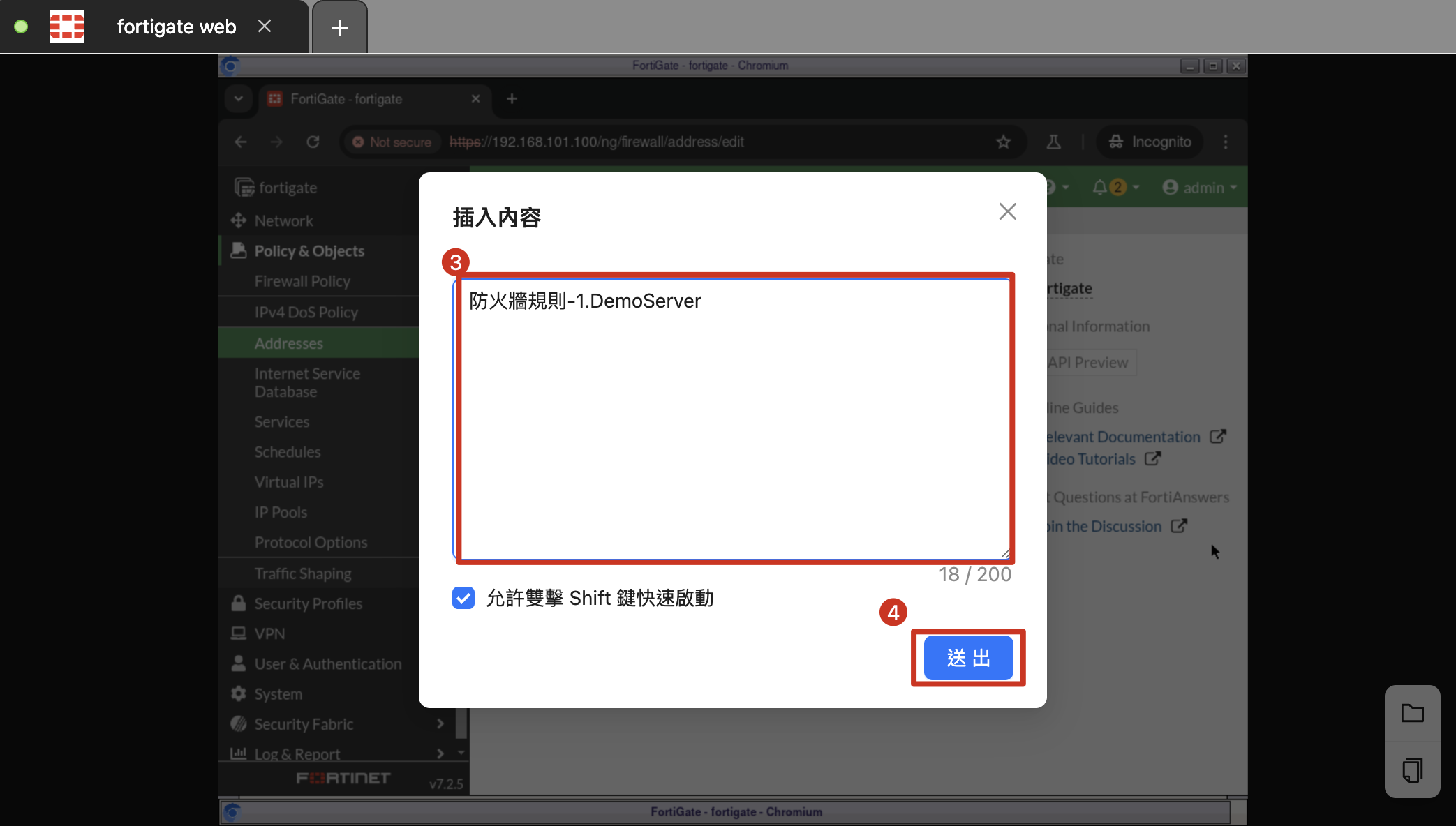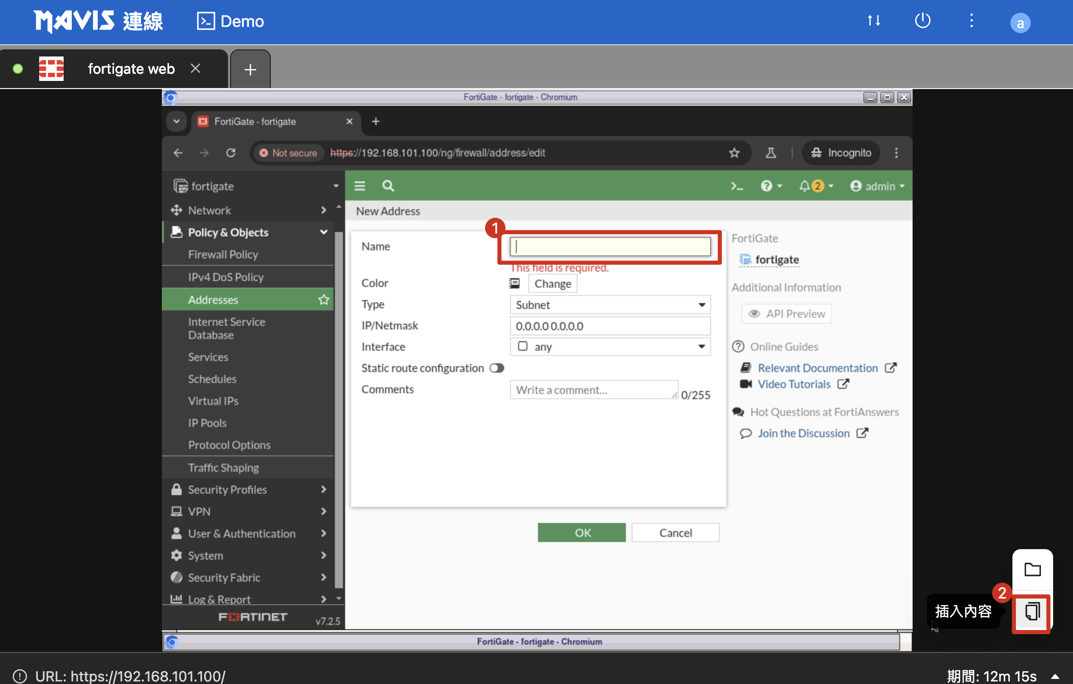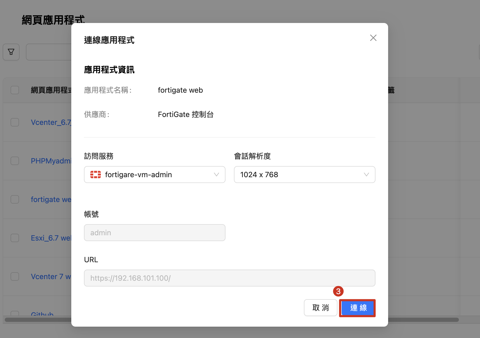 | 1. 點擊 網頁應用程式 (此範例FortiGate) 2. 點擊 要連線的網頁應用程式式 |