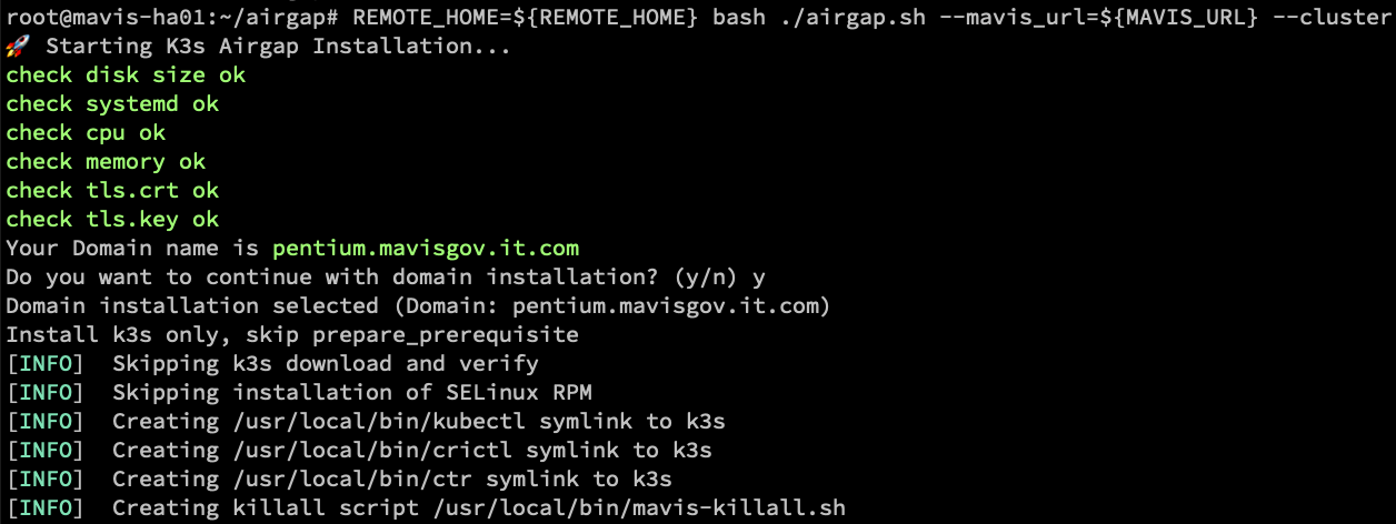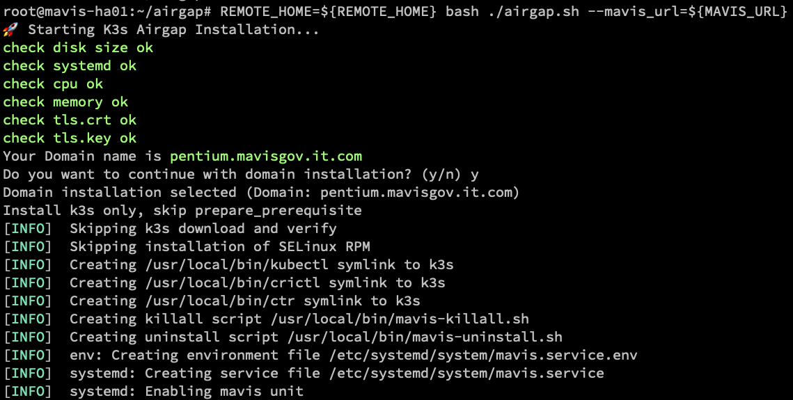 REMOTE_HOME=${REMOTE_HOME} bash ./airgap.sh --mavis_url=${MAVIS_URL}安裝過程中系統將自動: