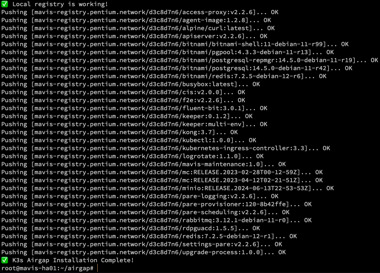出現「K3s Airgap Installation Complete!」訊息即代表安裝完成,後續可使用瀏覽器連線至 Mavis URL 存取系統服務。