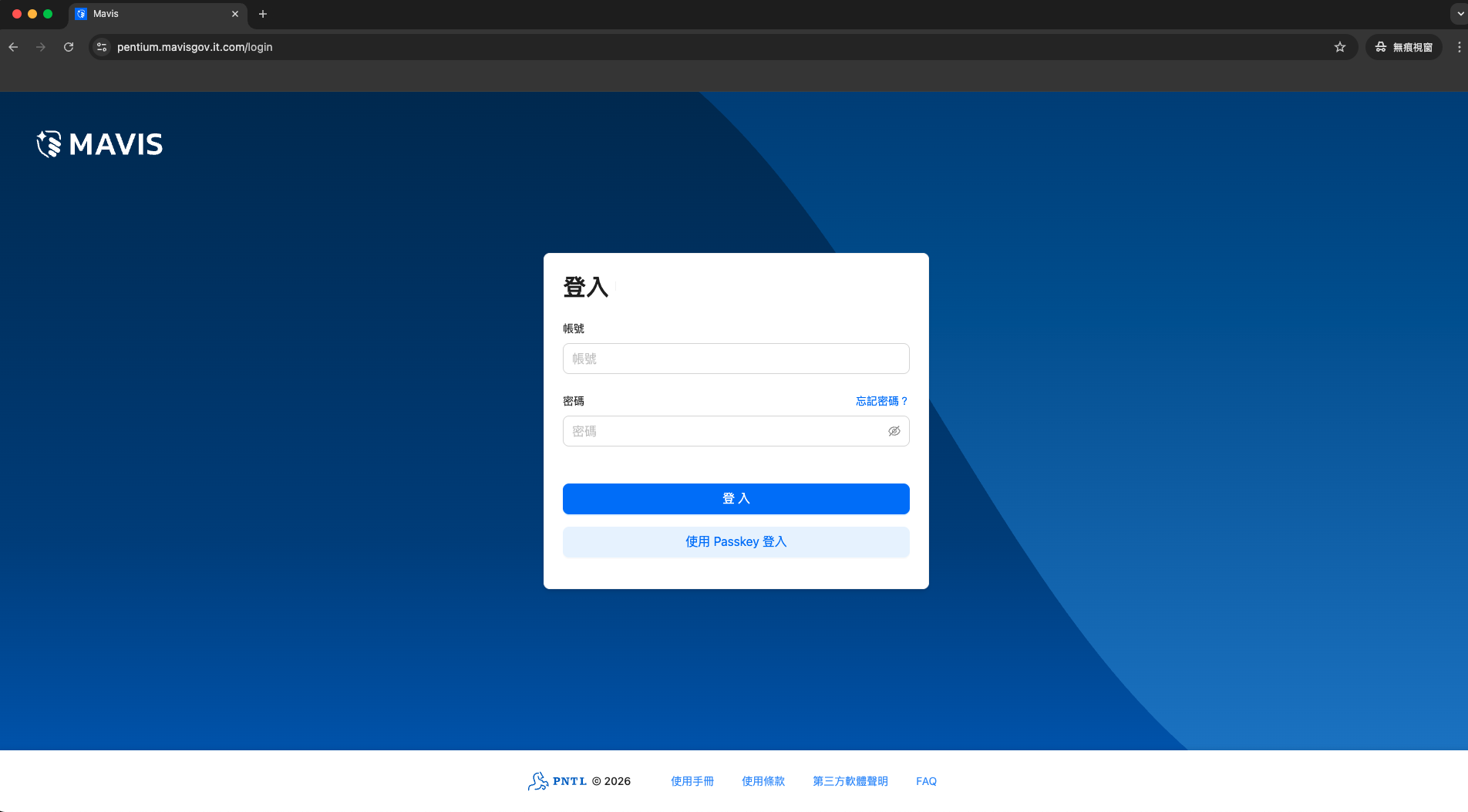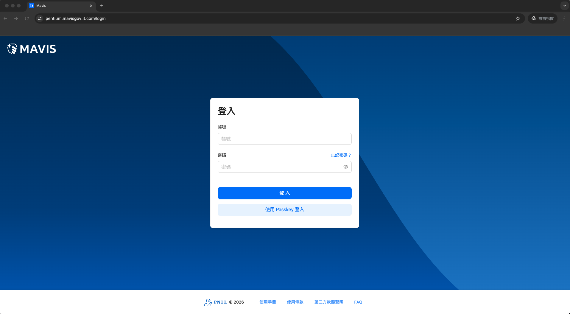 安裝完成後,請使用瀏覽器連線至 MAVIS_URL,並以預設帳號與密碼登入。
