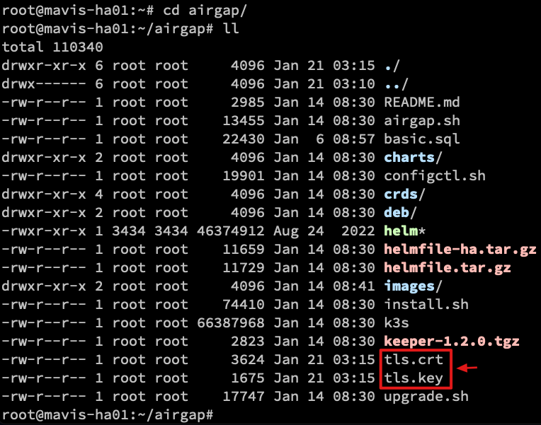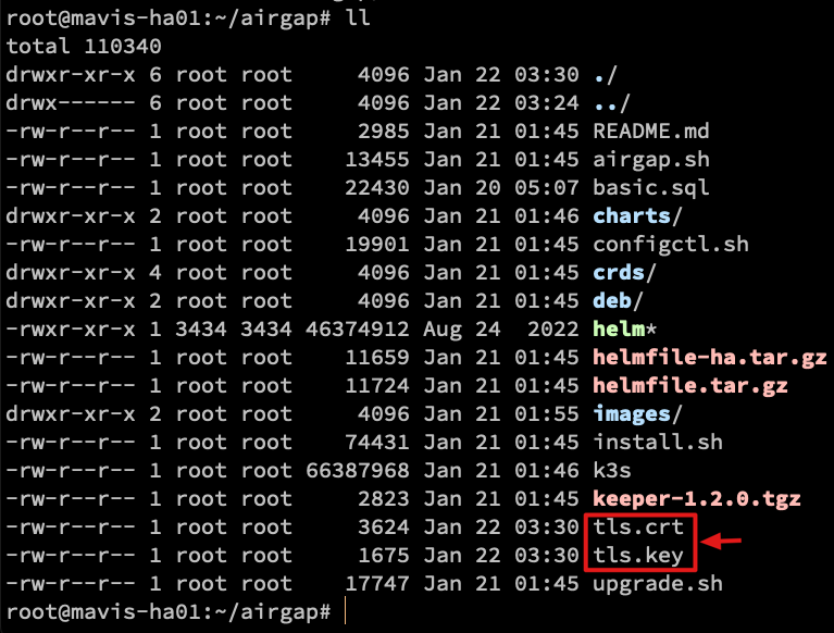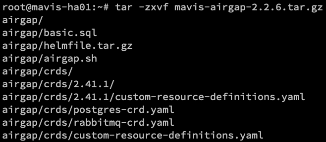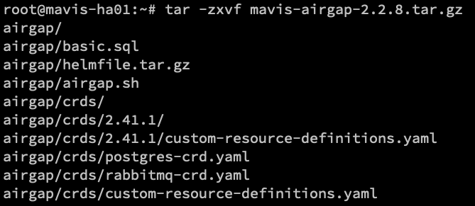 tar -zxvf mavis-airgap-2.2.8.tar.gz解壓完成後,將產生 airgap/ 目錄,內含安裝所需腳本與映像檔。