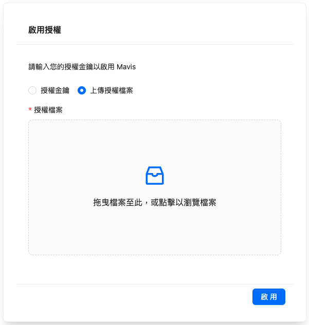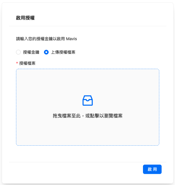 請向指定聯絡窗口索取 Mavis 離線版授權金鑰,並上傳授權檔案完成啟用。