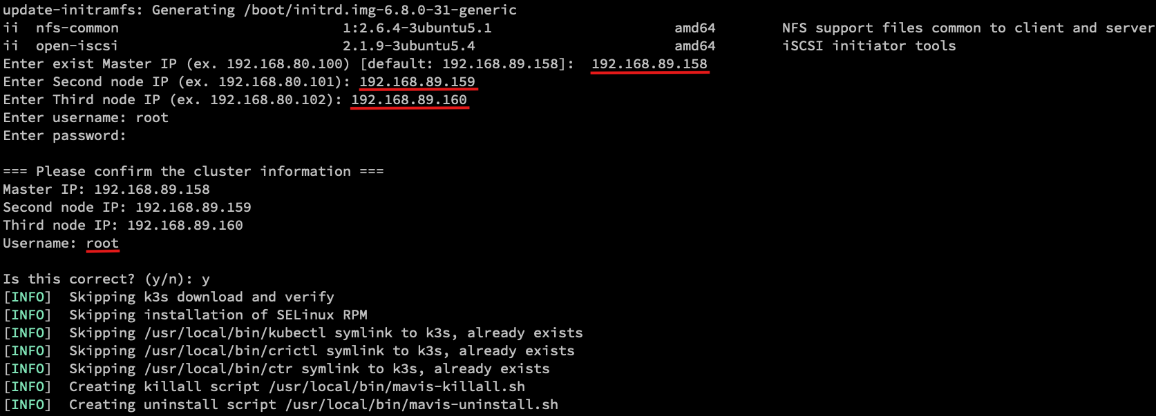 當安裝程序進行至節點設定階段時,系統將依序提示輸入 三台節點的 IP 位址及登入帳號、密碼。